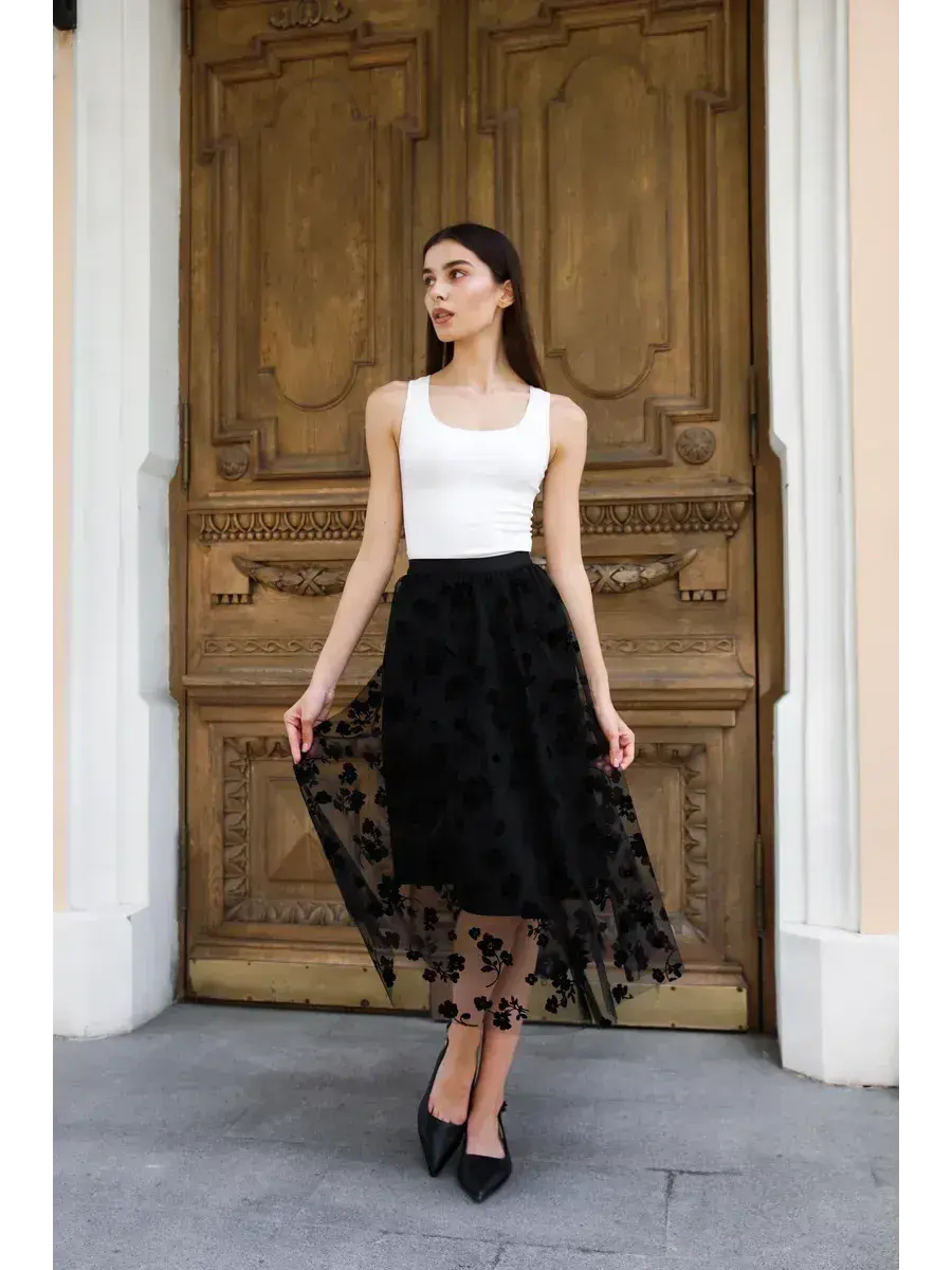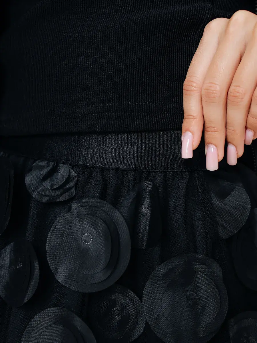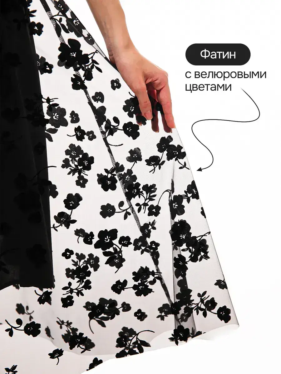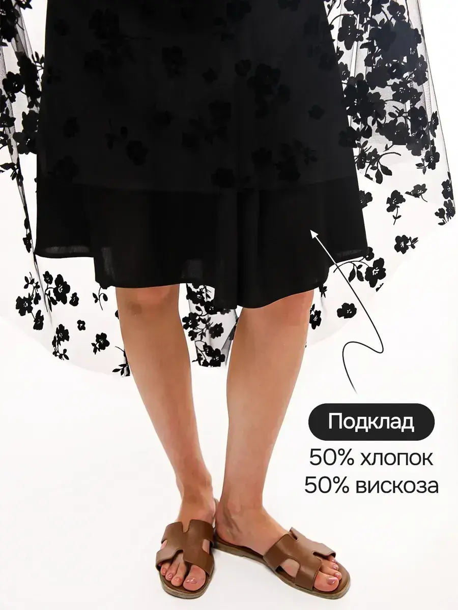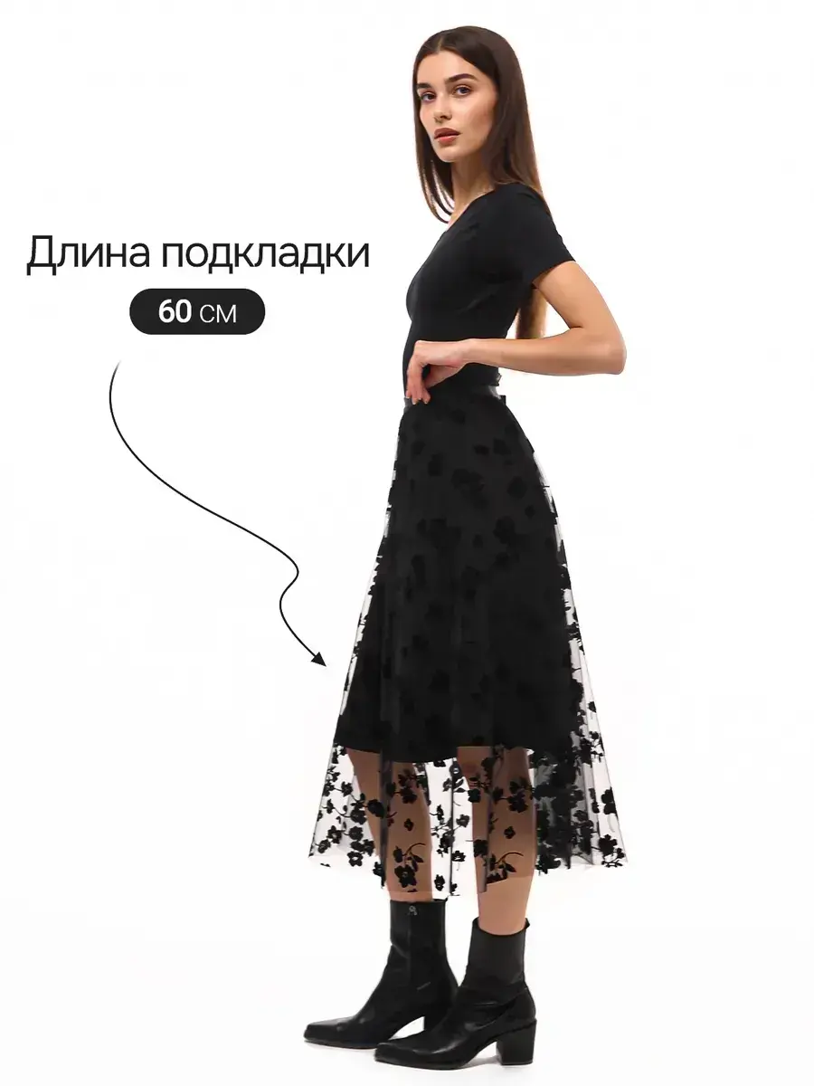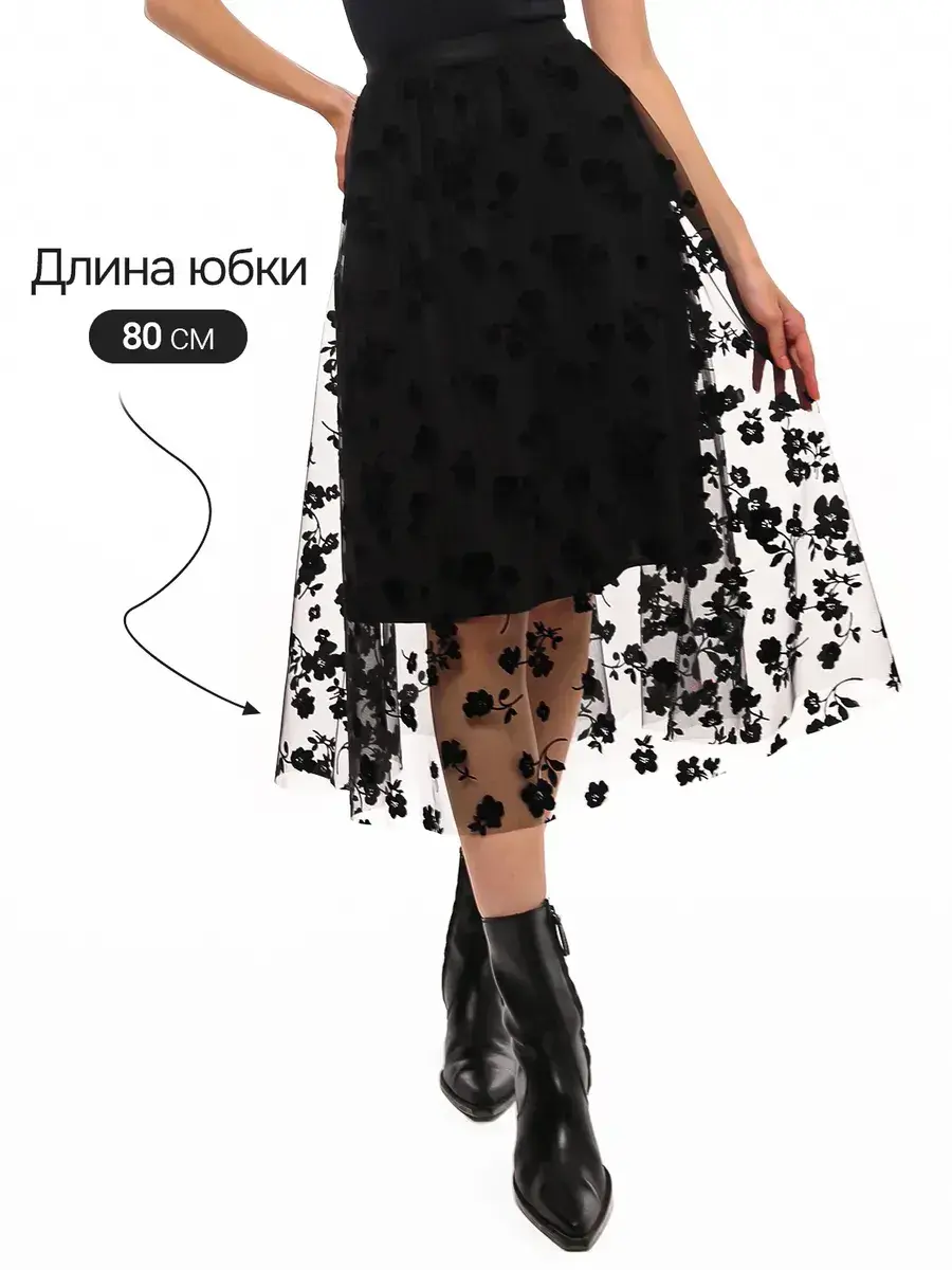 Легкая воздушная длинная юбка миди из мягкого фатина — идеальный выбор. Однотонная модель на удобной шелковой резинке выполнена в черном цвете и дополнена полупрозрачной сеткой с изящным цветочным принтом. Благодаря подкладу из вискозы и модному крою юбка выглядит стильно и уместна как для офиса, так и для торжеств — выпускного, корпоратива или праздника 1 сентября. Нарядная и женственная, она отлично подойдет девушкам и женщинам, ценящим элегантность и комфорт. Отличный вариант для вечеринки или школьного торжества.