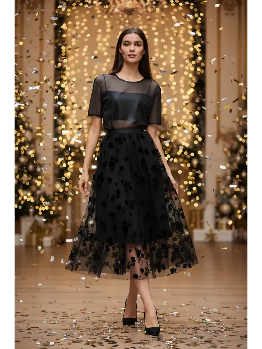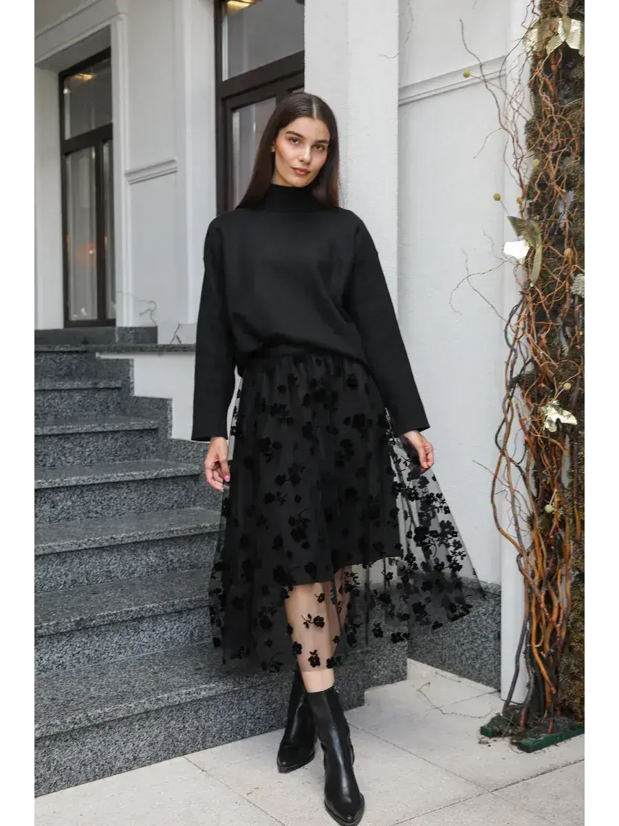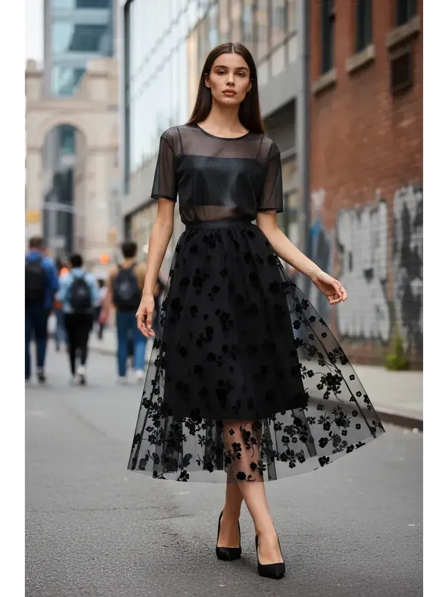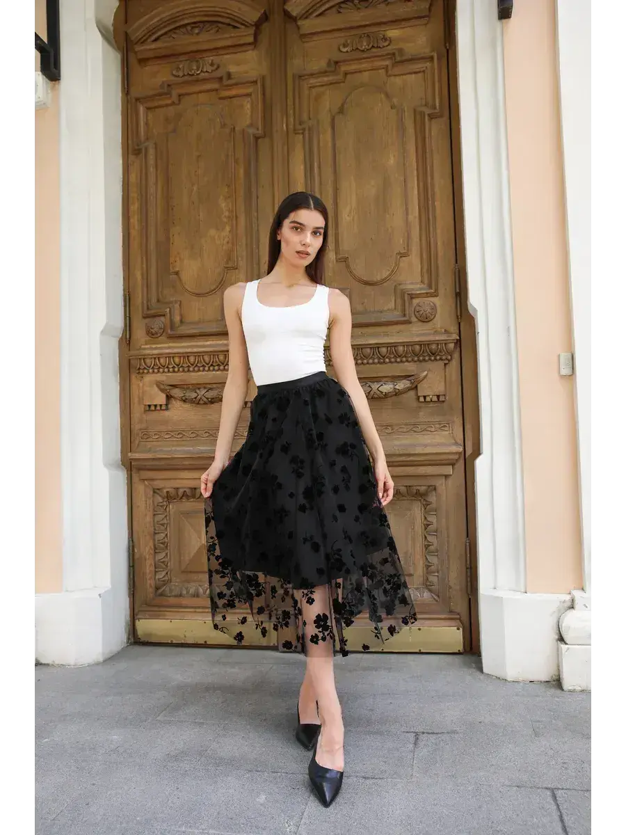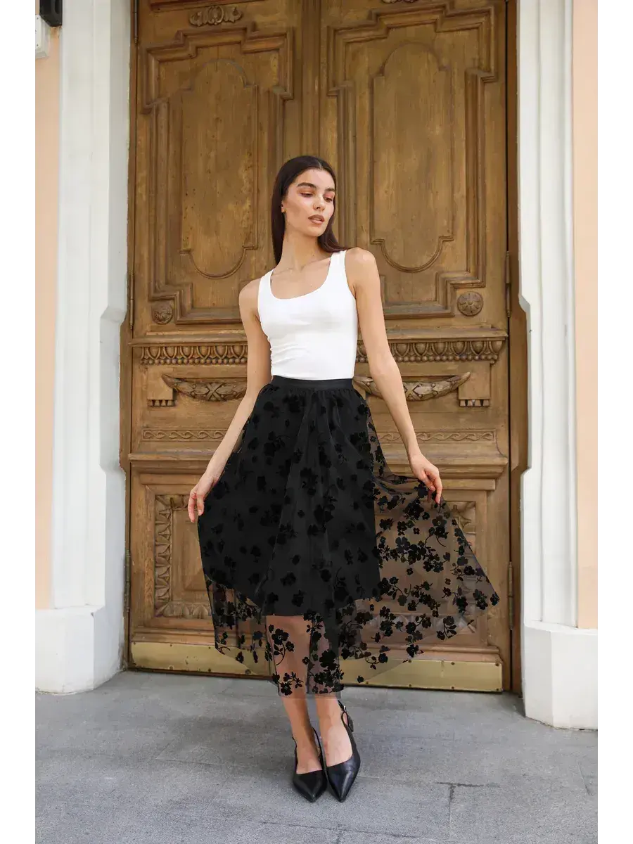 Легкая воздушная длинная юбка миди из мягкого фатина — идеальный выбор. Однотонная модель на удобной шелковой резинке выполнена в черном цвете и дополнена полупрозрачной сеткой с изящным цветочным принтом. Благодаря подкладу из вискозы и модному крою юбка выглядит стильно и уместна как для офиса, так и для торжеств — выпускного, корпоратива или праздника 1 сентября. Нарядная и женственная, она отлично подойдет девушкам и женщинам, ценящим элегантность и комфорт. Отличный вариант для вечеринки или школьного торжества.