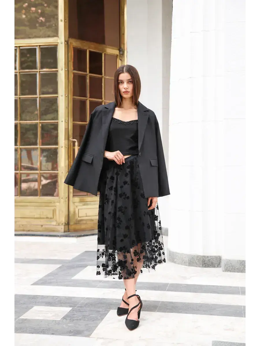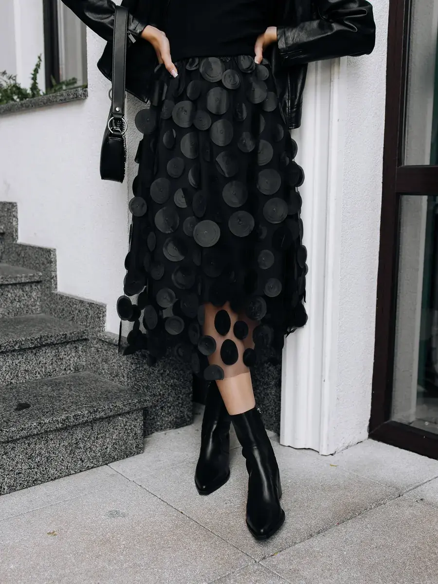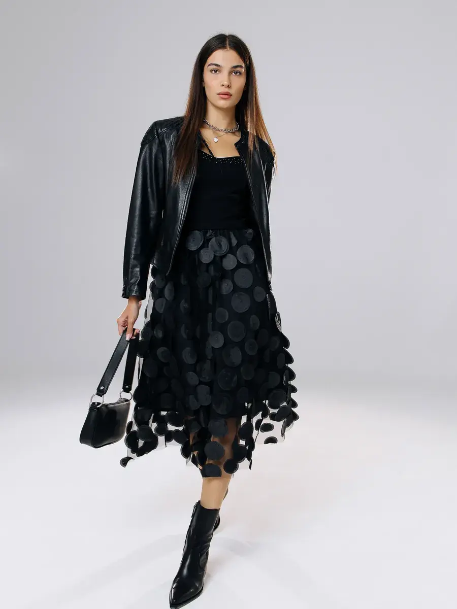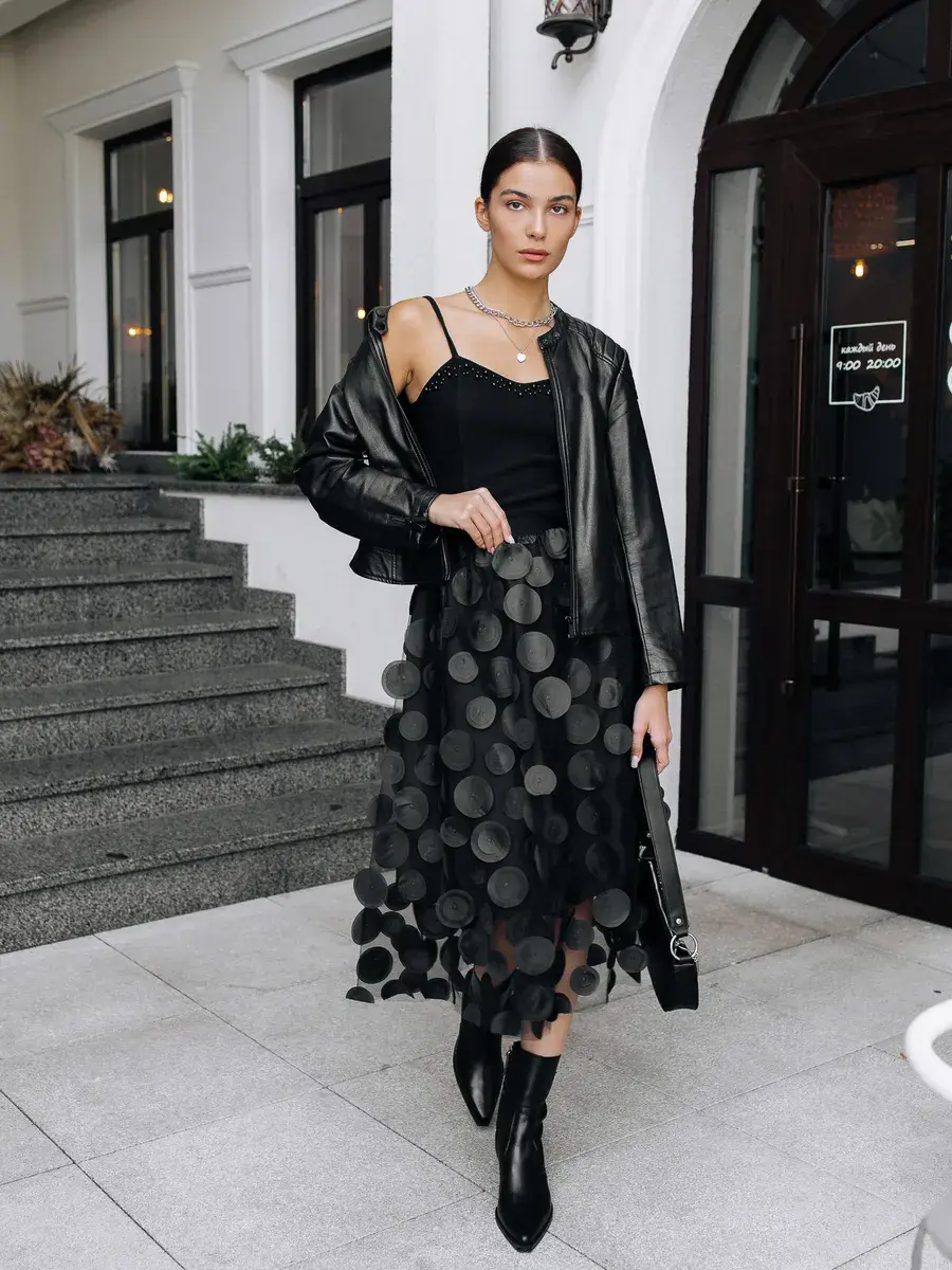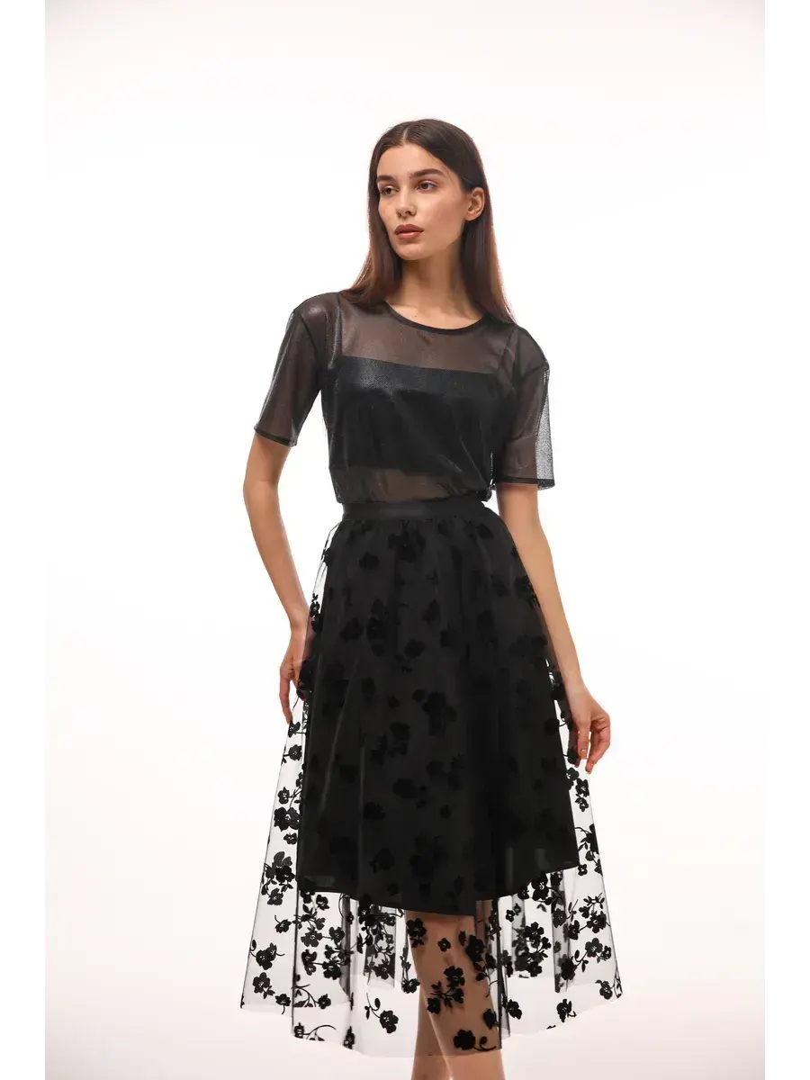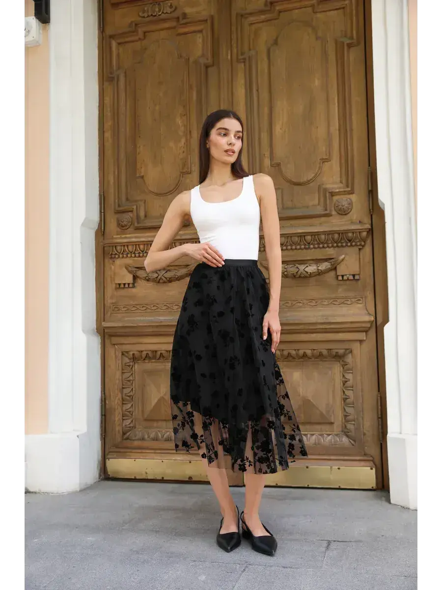 Легкая воздушная длинная юбка миди из мягкого фатина — идеальный выбор. Однотонная модель на удобной шелковой резинке выполнена в черном цвете и дополнена полупрозрачной сеткой с изящным цветочным принтом. Благодаря подкладу из вискозы и модному крою юбка выглядит стильно и уместна как для офиса, так и для торжеств — выпускного, корпоратива или праздника 1 сентября. Нарядная и женственная, она отлично подойдет девушкам и женщинам, ценящим элегантность и комфорт. Отличный вариант для вечеринки или школьного торжества.