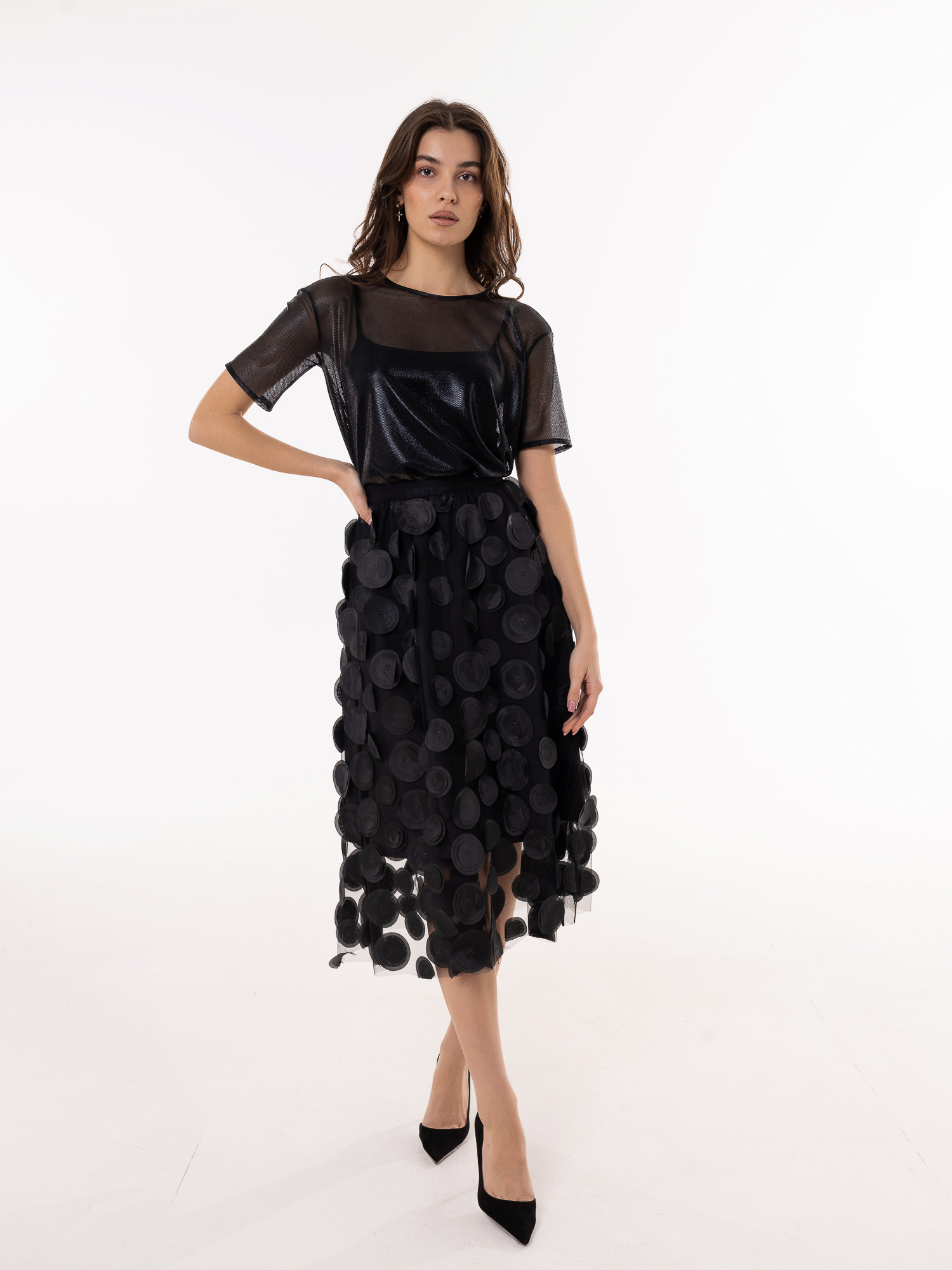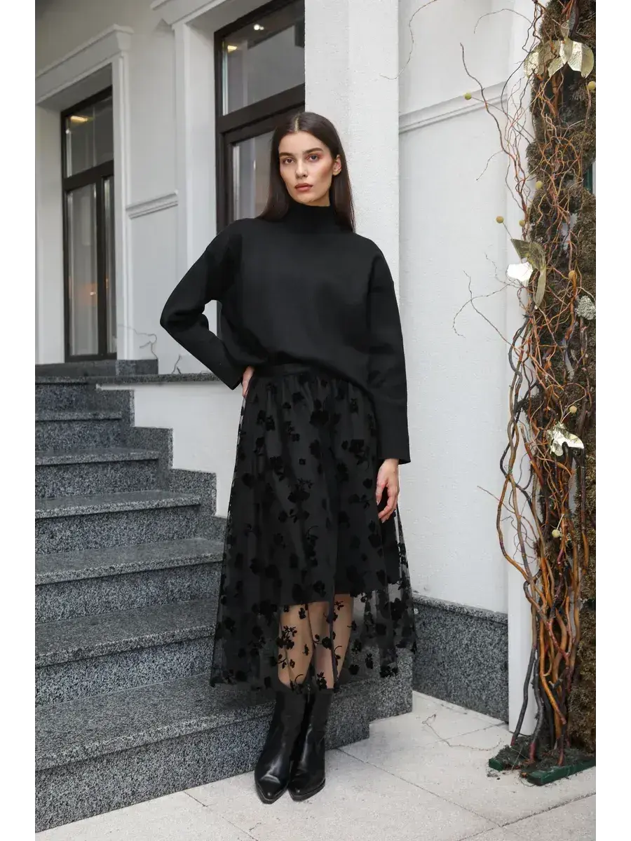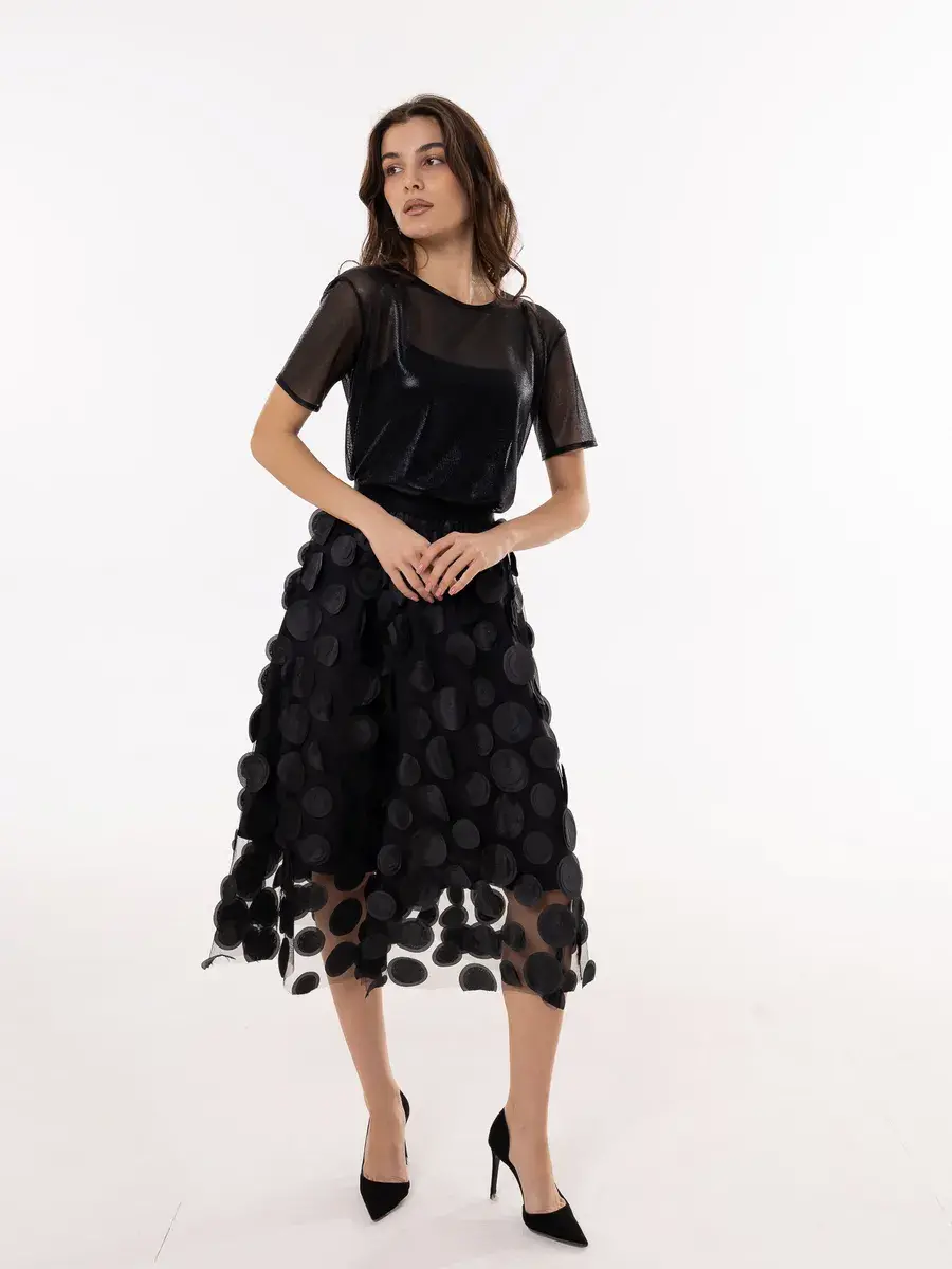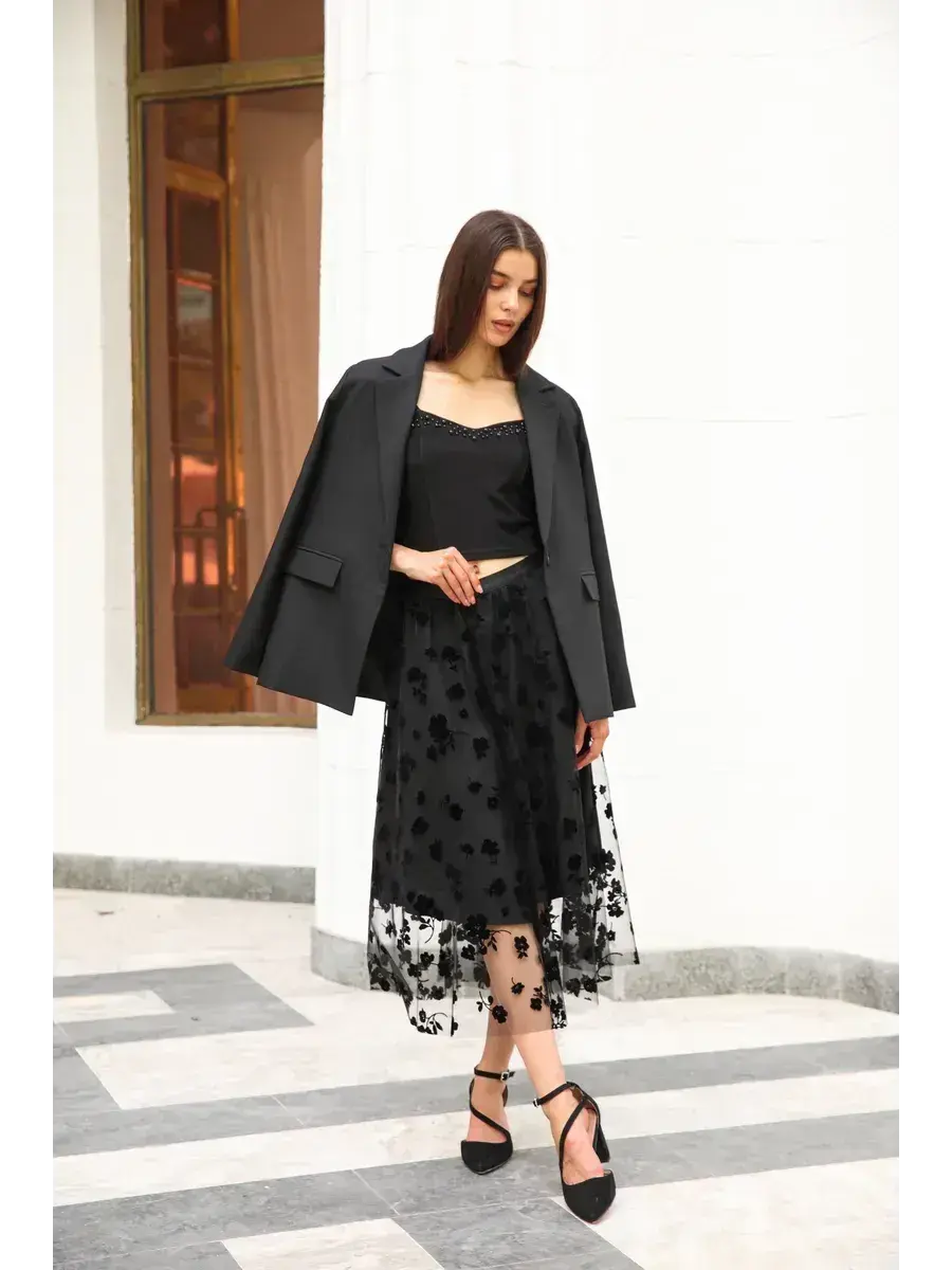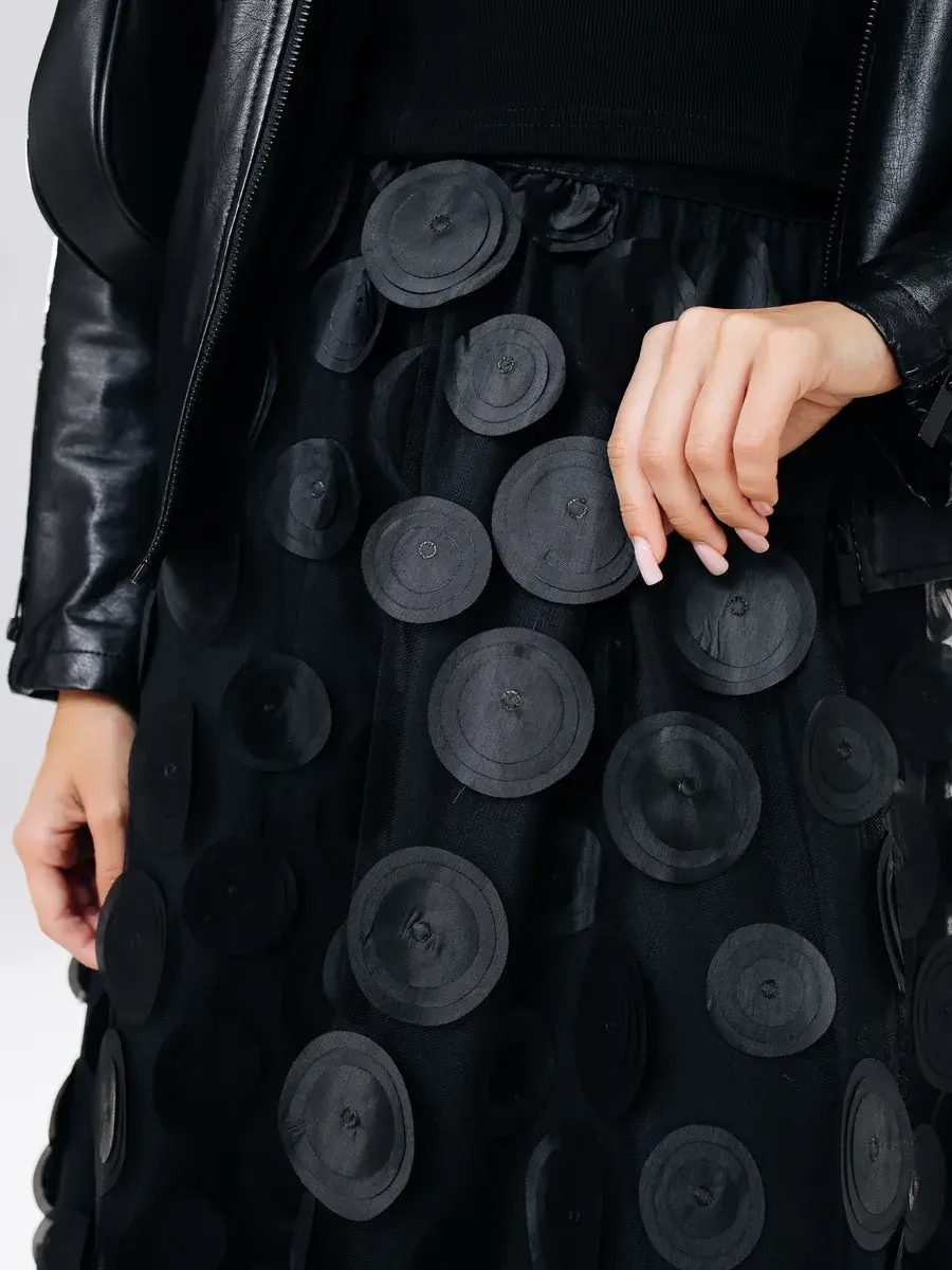 Легкая воздушная длинная юбка миди из мягкого фатина — идеальный выбор. Однотонная модель на удобной шелковой резинке выполнена в черном цвете и дополнена полупрозрачной сеткой с изящным цветочным принтом. Благодаря подкладу из вискозы и модному крою юбка выглядит стильно и уместна как для офиса, так и для торжеств — выпускного, корпоратива или праздника 1 сентября. Нарядная и женственная, она отлично подойдет девушкам и женщинам, ценящим элегантность и комфорт. Отличный вариант для вечеринки или школьного торжества.