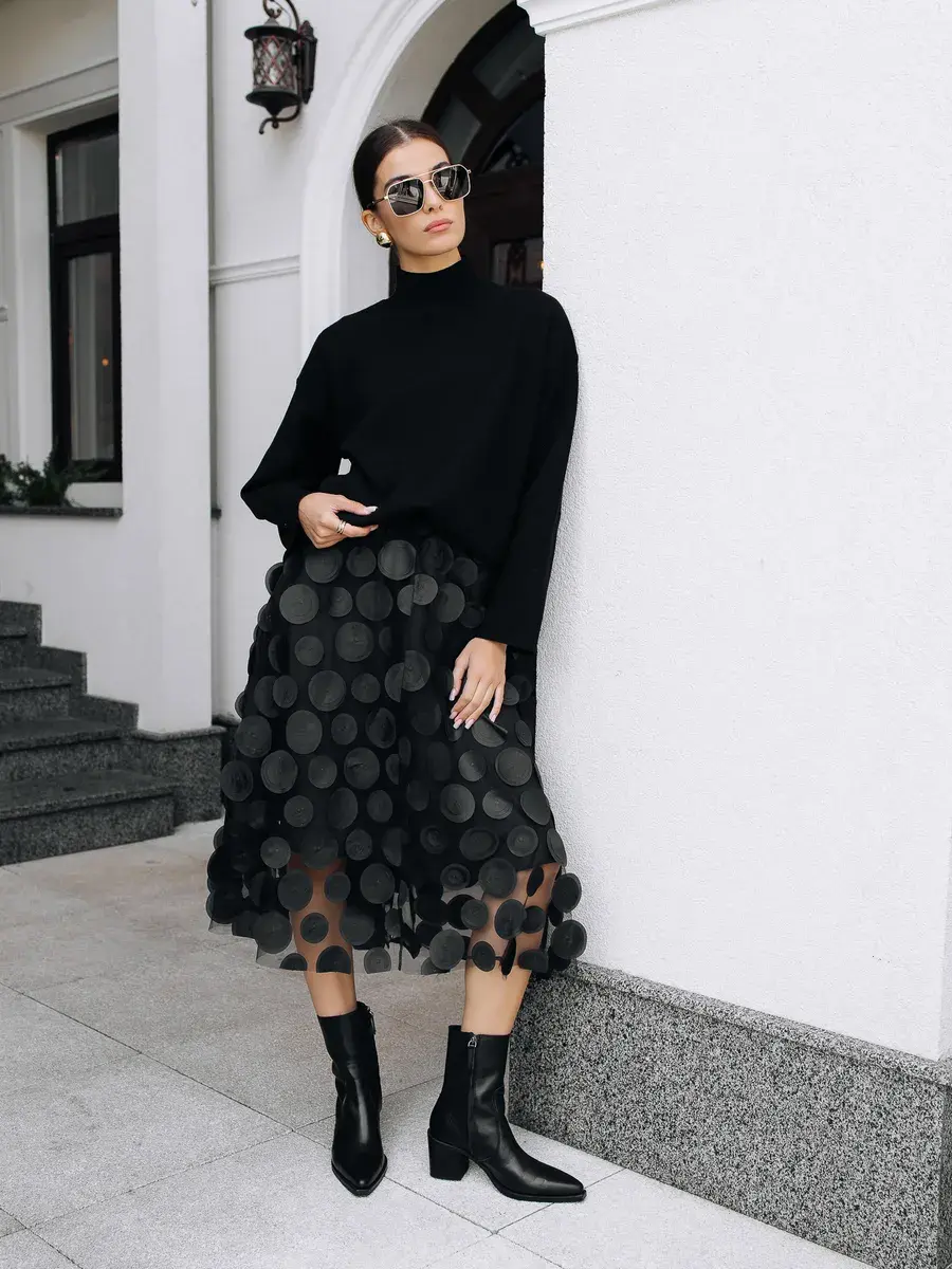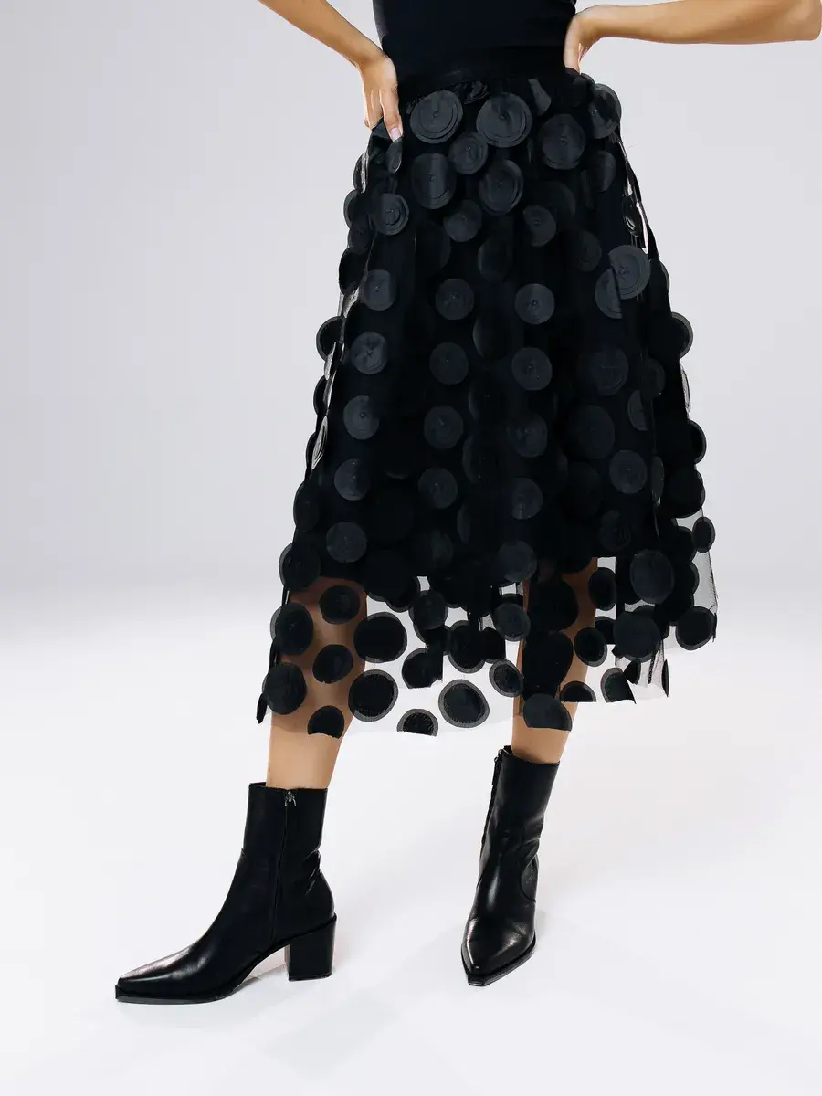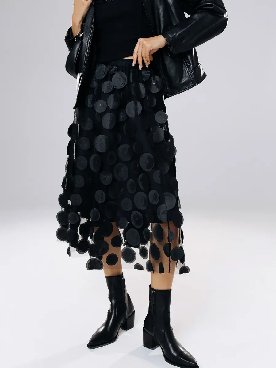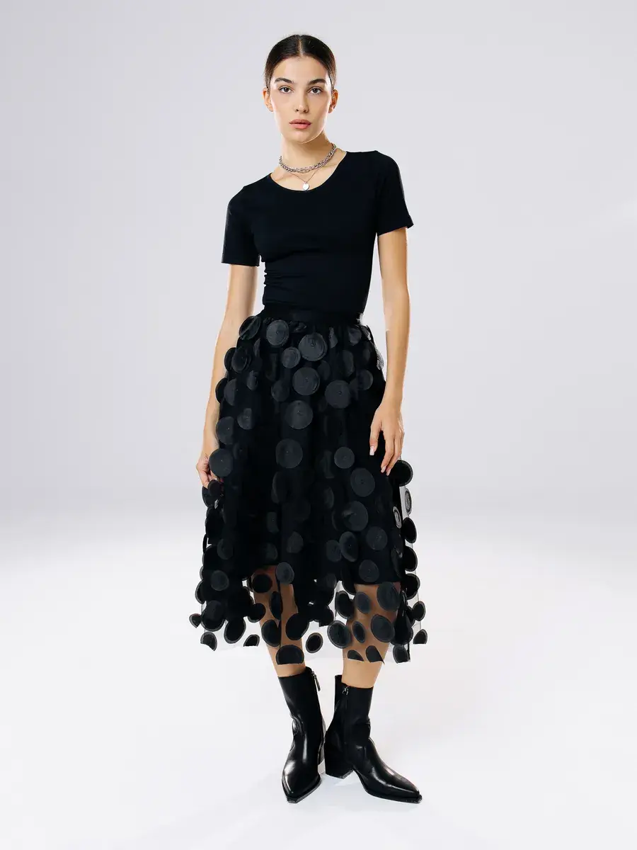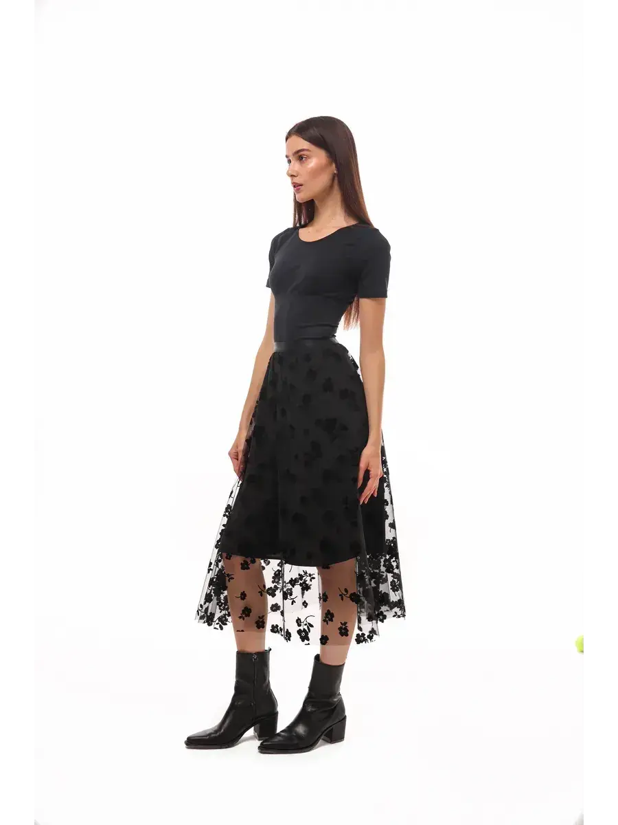 Легкая воздушная длинная юбка миди из мягкого фатина — идеальный выбор. Однотонная модель на удобной шелковой резинке выполнена в черном цвете и дополнена полупрозрачной сеткой с изящным цветочным принтом. Благодаря подкладу из вискозы и модному крою юбка выглядит стильно и уместна как для офиса, так и для торжеств — выпускного, корпоратива или праздника 1 сентября. Нарядная и женственная, она отлично подойдет девушкам и женщинам, ценящим элегантность и комфорт. Отличный вариант для вечеринки или школьного торжества.