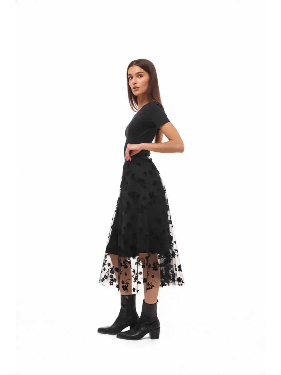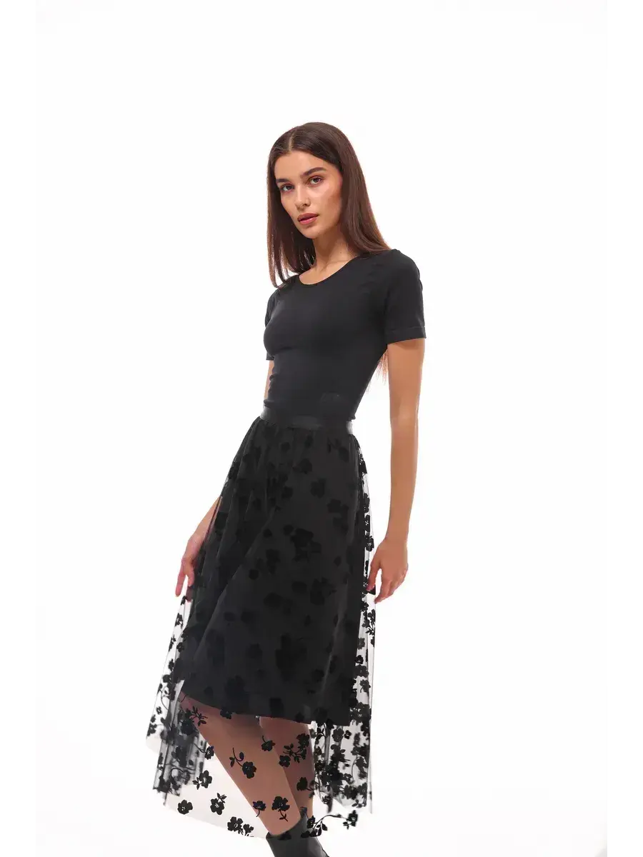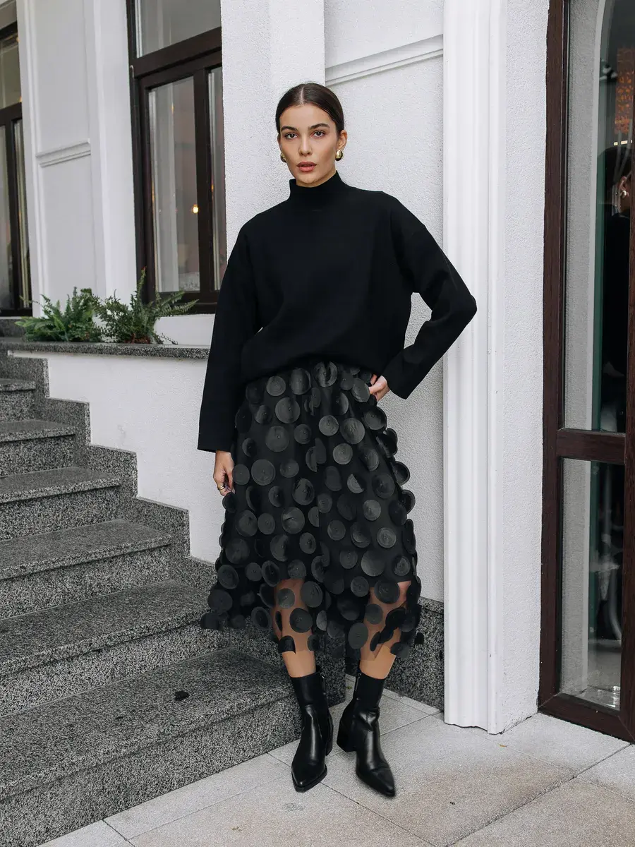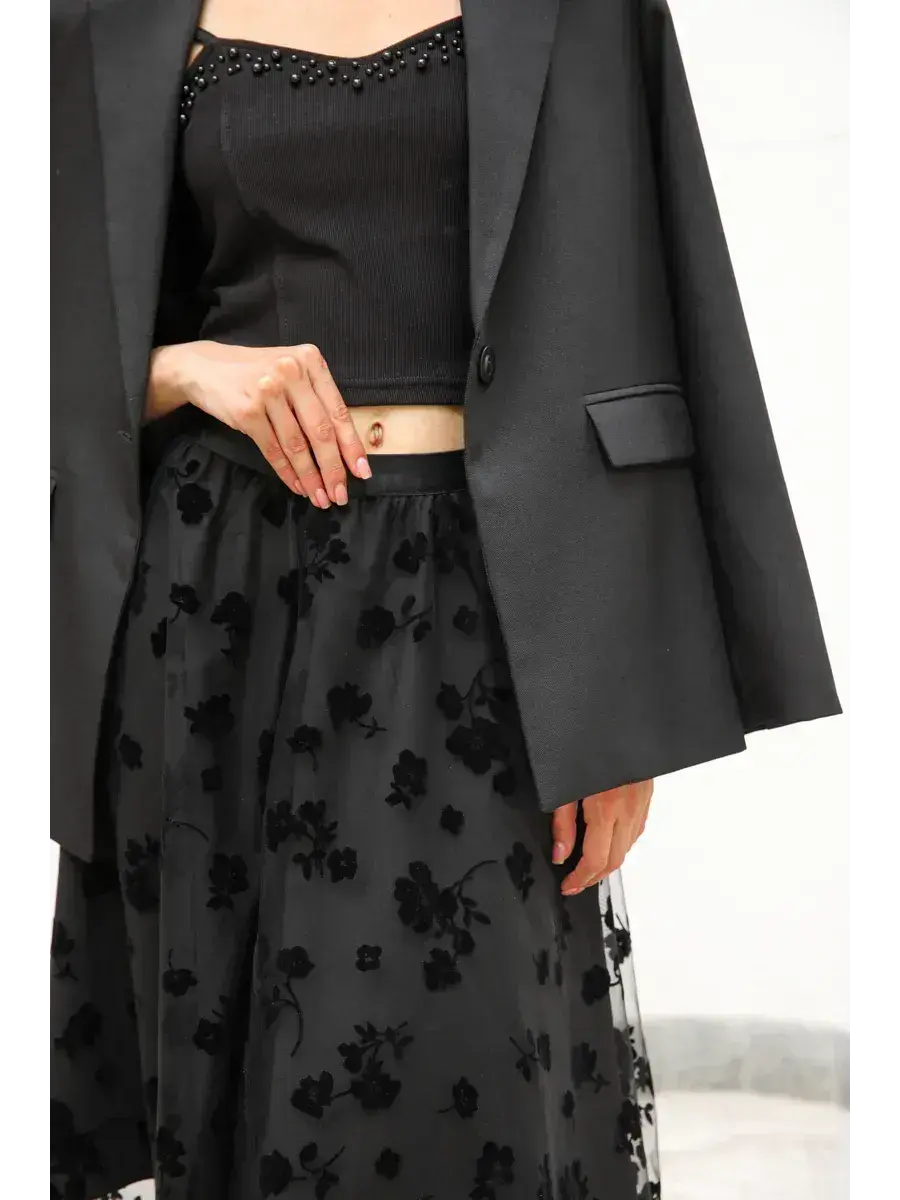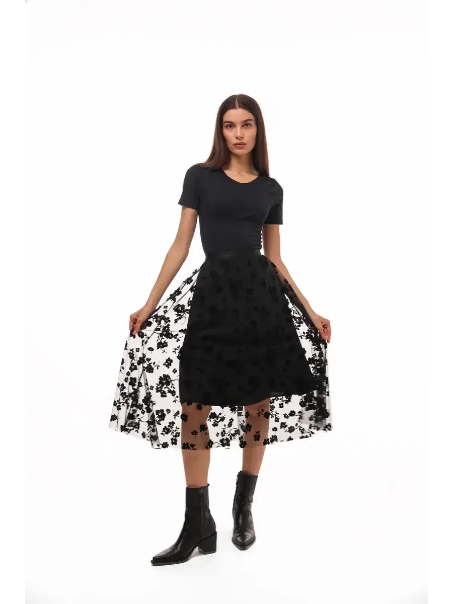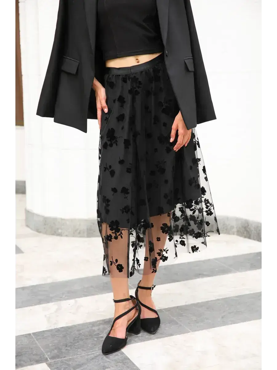 Легкая воздушная длинная юбка миди из мягкого фатина — идеальный выбор. Однотонная модель на удобной шелковой резинке выполнена в черном цвете и дополнена полупрозрачной сеткой с изящным цветочным принтом. Благодаря подкладу из вискозы и модному крою юбка выглядит стильно и уместна как для офиса, так и для торжеств — выпускного, корпоратива или праздника 1 сентября. Нарядная и женственная, она отлично подойдет девушкам и женщинам, ценящим элегантность и комфорт. Отличный вариант для вечеринки или школьного торжества.