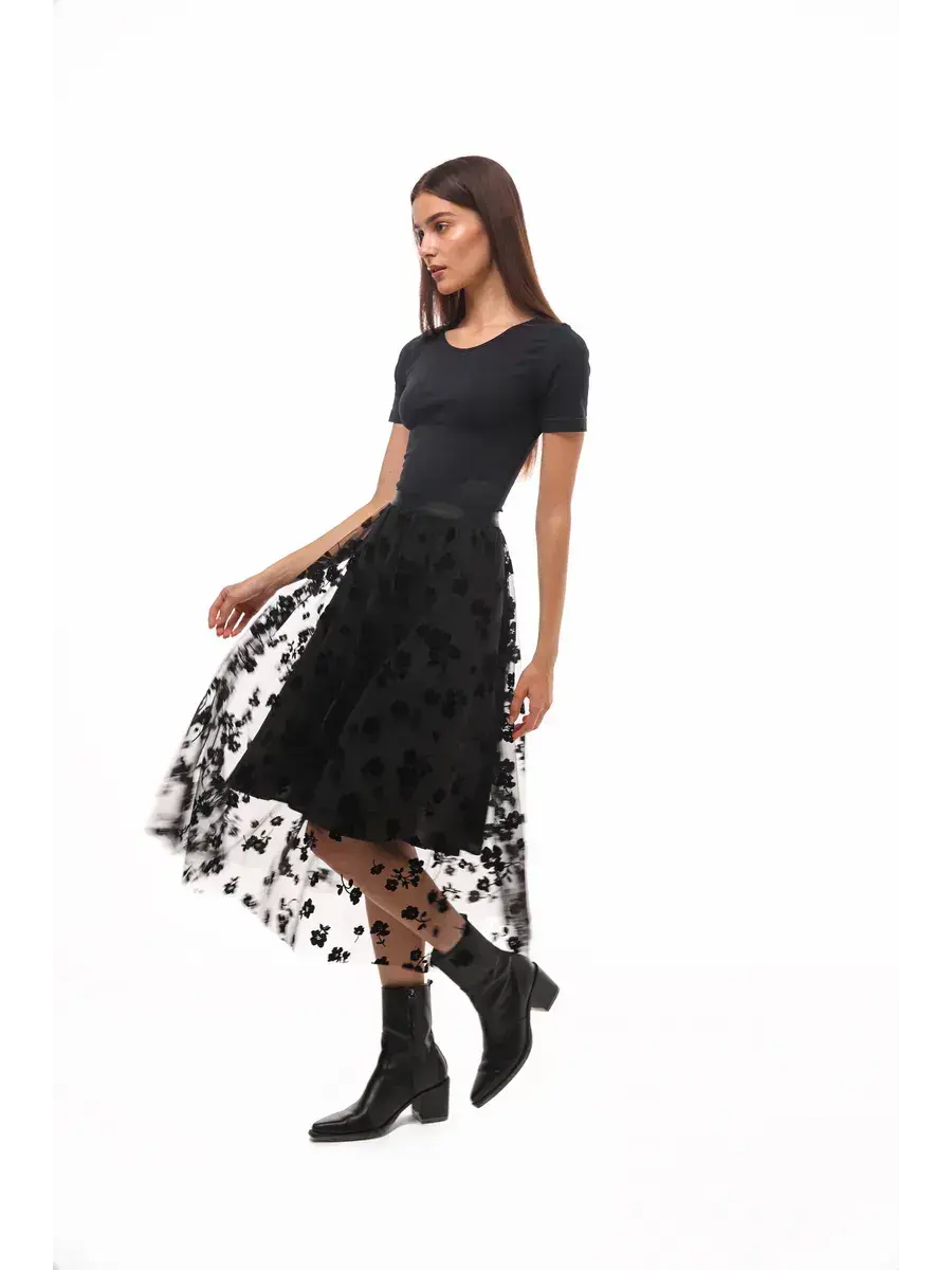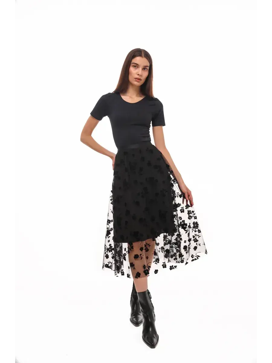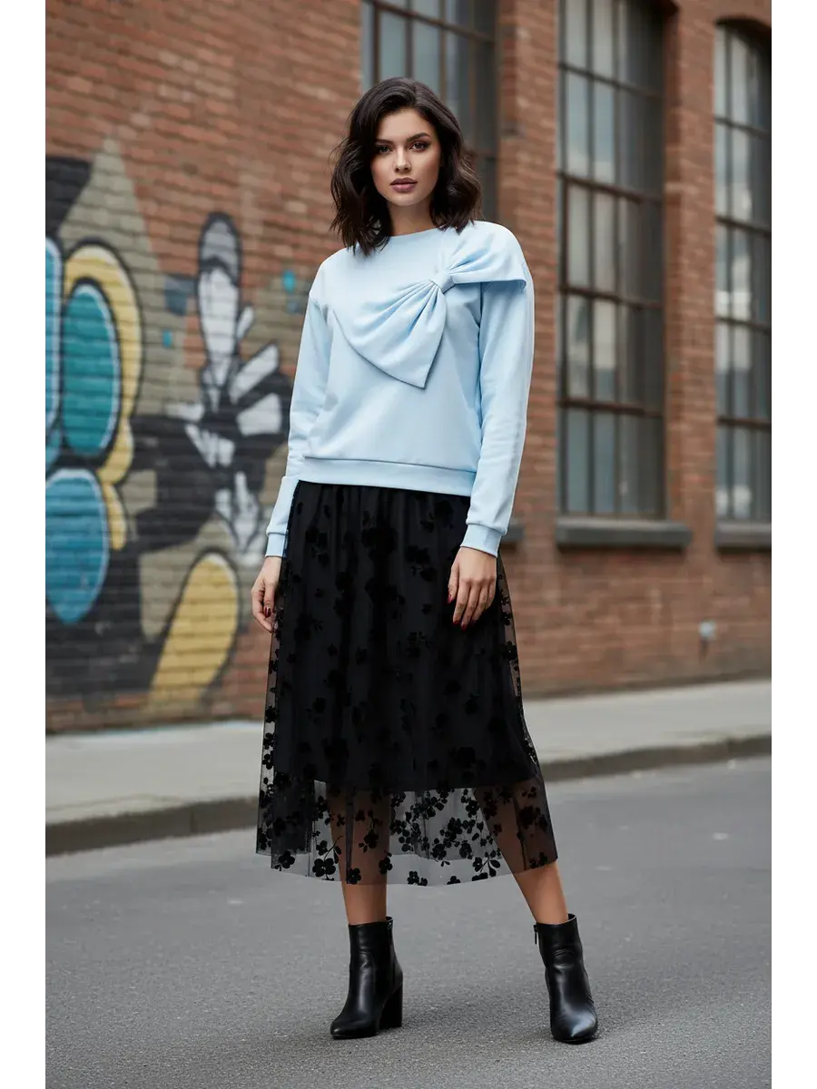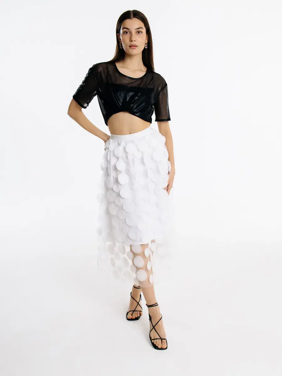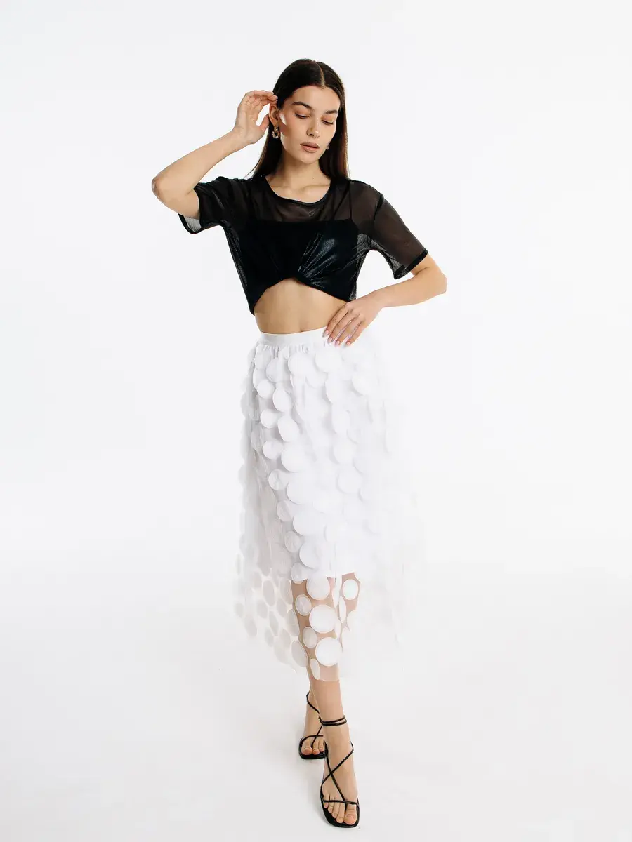 Легкая воздушная длинная юбка миди из мягкого фатина — идеальный выбор. Однотонная модель на удобной шелковой резинке выполнена в черном цвете и дополнена полупрозрачной сеткой с изящным цветочным принтом. Благодаря подкладу из вискозы и модному крою юбка выглядит стильно и уместна как для офиса, так и для торжеств — выпускного, корпоратива или праздника 1 сентября. Нарядная и женственная, она отлично подойдет девушкам и женщинам, ценящим элегантность и комфорт. Отличный вариант для вечеринки или школьного торжества.
